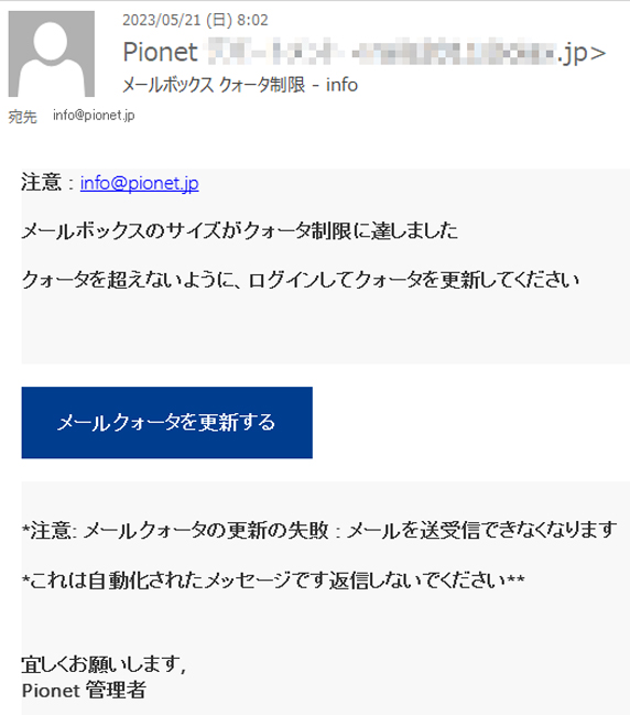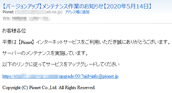 下図のように、最近、Pionetの名前をつかい、メールの不具合解消やサービスのアップグレードをうながす内容で、当社とは無関係なホームページへ誘導するような不審なメールが確認されました。